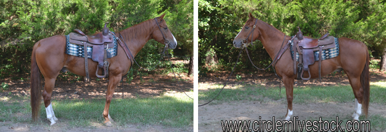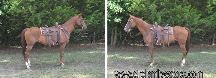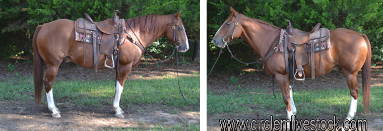 Sox, a 10 year old, 14.3 hand, stocky, ranch-broke, Sorrel with four white socks, Quarter horse gelding has been sold to Denise from Rougemont, NC. Thanks!